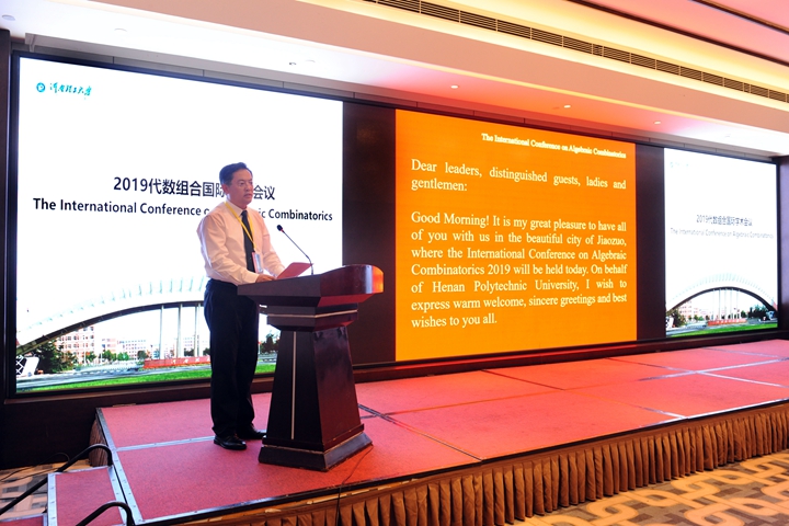 9月20日至24日,2019代数组合国际学术会议在我校召开,来自国内外的近150名专家学者参加了此次会议。9月21日上午,会议在焦作市迎宾馆举行了开幕式。我校副校长解伟,会议学术委员会主席杜少飞、杰克·库伦出席,开幕式由数信学院院长原保全主持。