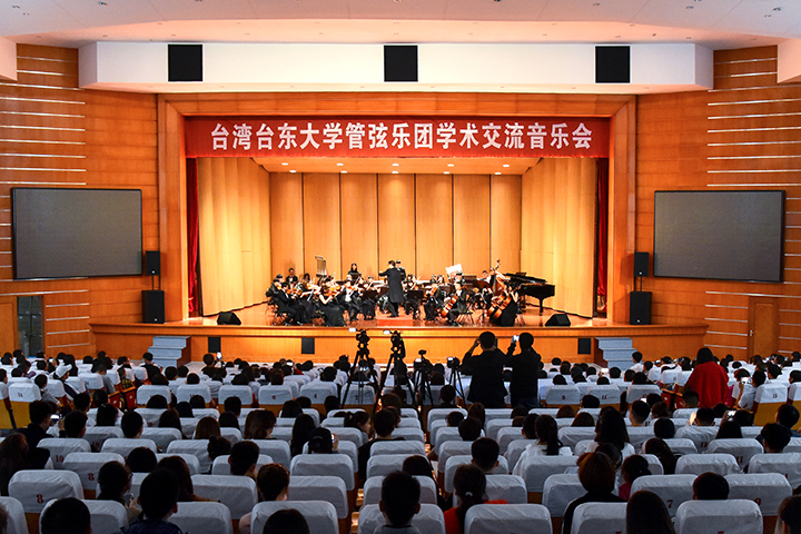 5月21日上午,郭美女一行与我校音乐学院进行了学术交流。晚上,台湾台东大学管弦乐团学术交流音乐会在我校音乐厅隆重举行。我校副校长翟传森出席了本次音乐会,该院相关负责人和师生代表800余人共同聆听此次音乐会。音乐会在一曲激昂的《匈牙利舞曲第五号》合奏中拉开帷幕。李浩平独唱《往昔的夜晚多宁静》,高音自如,气息控制运用合理,展现出教师的高超技术。长笛独奏《“弄臣”幻想曲》音色圆润细腻,表现力丰富,展现出学生对乐器的把握之精准。《歌剧维也纳的早中晚序曲》的合奏中大鼓雄浑震响凌空而起,小提琴悠扬婉转,纷乱中见和谐。《高山青》和《兰阳舞曲》乐声灵动活泼,饱含台湾风情。李新现为大家带来的《妈妈》和《那就是我》热情高亢、嗓音深沉,把母亲的满腔深爱展现的淋漓尽致,表达了海峡两岸之间的深厚情谊。《火焰之舞》和《电影神鬼奇航配乐》气势如虹,为大家带来一场动感与质感相匹配的视听盛宴。最后乐团与现场观众的互动把晚会推向最高潮。