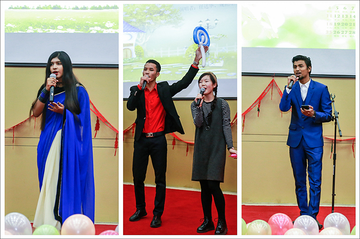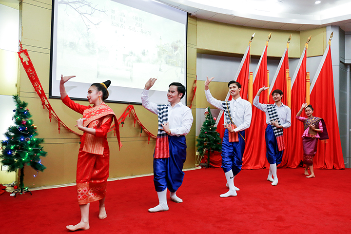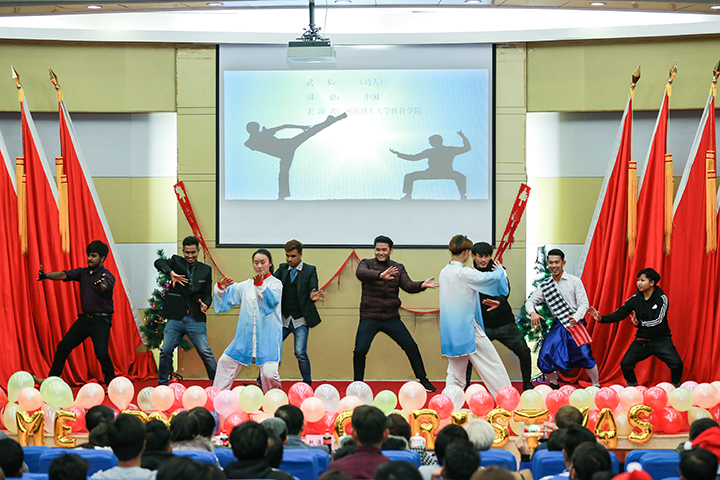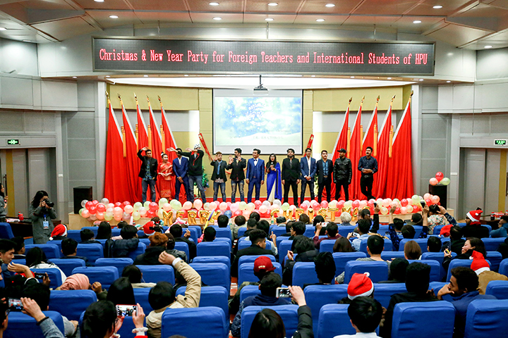 12月22日晚,由国际教育学院、国际合作交流处(港澳台事务办公室)主办的“河南理工大学2017年外教和国际学生圣诞新年联欢晚会”在圆形报告厅举办。副校长赵俊伟出席,国际教育学院、国际合作交流处(港澳台事务办公室)、计算机学院、土木学院、财经学院、体育学院、文法学院、数信学院、外国语学院的相关负责人参加了晚会。来自美国、孟加拉、老挝、巴基斯坦、印度、坦桑尼亚、埃塞俄比亚、赤道几内亚等22个国家的国际学生,全体外籍教师和部分中国学生代表近200人欢聚一堂,喜迎圣诞新年。