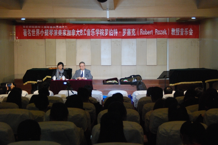 3月28日晚,加拿大B.C音乐学院教授罗伯特·罗赛克应我校音乐学院之邀,在该院音乐厅作学术讲座。该院院长李新现参加并主持,相关专业师生和小提琴爱好者一百余人参加讲座,讲座由旅加女高音歌唱家陈熹作现场翻译。