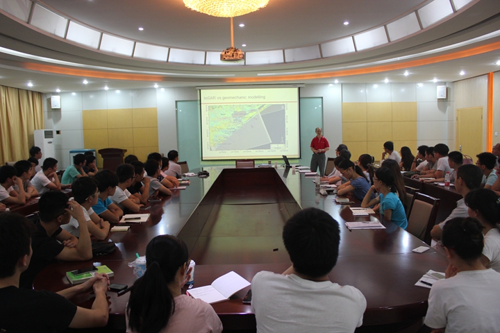 在《卫星灾害监测与预警》报告会上,葛林林主讲了目前最先进的第四代雷达遥感及分布式干涉处理技术在洪涝、地震、开采沉陷、城市地表沉降等方面的应用,该技术对于解决大变形、准实时、三维观测等雷达遥感领域难点、热点问题具有广阔的应用前景,并对这些技术在尼泊尔地震、四川地震、印尼万隆城市地表沉降、澳大利亚沿海岸地表沉陷等灾害中发挥的具体作用一一做了详细的说明。在《卫星干涉与无人机摄影测量集成,三维测图与形变监测》的报告会上,葛林林以在澳大利亚的生活学习情况为基础,把全体学生的兴趣与积极性都调动起来;随后以卫星、无人机等技术遥感监测应用为主题,并通过视频、图片等多种方式给学生讲解这种技术的应用,根据土木学科的特点讲解了在检测沉降方面的优势,利用雷达干涉结果在空间域及时间域上的高密度优势,结合地下水开采总量统计及地下水位变化的记录,系统地分析了地表沉降与地下水位变化的相关性。在《近实时卫星遥感监测自然灾害——从2008年汶川地震到2015年尼泊尔地震》报告会上,葛林林介绍了新南威尔士大学的历史与发展状况、光学遥感与雷达遥感的区别,深入介绍了雷达遥感的原理与在工程中的应用现况和前景。他成功地将雷达遥感技术应用于2008年中国汶川地震与2015年尼泊尔地震,对救援与余震预测起到很大作用。