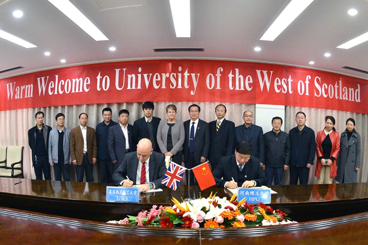 杨小林首先对曼哈尼的到访表示热烈欢迎,在向客人介绍了我校的办学基本条件、师资与学生规模、学科设置与建设、科研优势与成果、学校服务面向等情况后,简要介绍了河南省的高等教育情况及发展机遇,并指出了我国“一带一路”倡议对高等教育的新要求和国际交流的重要性。杨小林还回顾了近年来两校密切的交流情况,并对两校开展本科生“3+1”“4+1”和研究生“1+1”合作项目联合培养学生,教师互访、教学科研合作以及利用河南历史悠久、文化灿烂、学校太极拳教育实力雄厚等优势共同申办孔子学院提出了希望。随后,曼哈尼介绍了西苏格兰大学的概况、学院及专业设置、师资及学生规模等基本情况,表示非常赞同校长杨小林提出的两校深度合作交流构想,将会尽力支持和协助两校的合作项目。相关学院及职能部门负责人还就将来学院间的合作细节展开了进一步商讨,简·凯热情回答了许多具体问题。最后,杨小林与曼哈尼在两校合作备忘录上签字并合影留念。