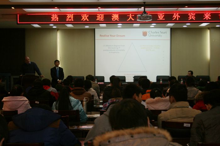 硕士留学项目宣讲会随后在计算机学院学术报告厅举行。此项目学习期限为2年,共学习16门课程,其中12门在查尔斯特大学进行,4门在ITIC信息技术有限公司进行。Jason Howarth介绍了查尔斯特大学的地理位置、培养方案等内容。金维周介绍了澳大利亚IT行业的发展,并介绍了澳大利亚硕士培养概况、项目开展初衷、实习计划、项目特色等诸多方面的细节,并就学生关心的问题作了现场解答。