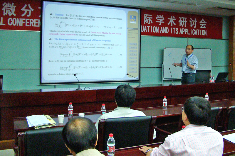 会上,学术委员会主席郭柏灵院士,先就非线性偏微分方程最新发展状况给大家做了介绍,并指出了急需要解决的重点课题。接着,来自香港城市大学的杨彤教授为大家介绍了“一般系统的双曲守恒定律的一个新Glimm函数”。 北京应用物理与计算数学研究所研究员苗长兴就“在Triebel-Lizorkin空间中的方程的适定性”给大家做了精彩的报告。随后,中科院的曹道民、浙江大学的孔德兴、武汉大学的赵会江、重庆大学的穆春来、吉林大学的尹景学、郑州大学的杨志坚、河南大学的张瑞凤等代表就自己的研究成果和大家展开了交流。
