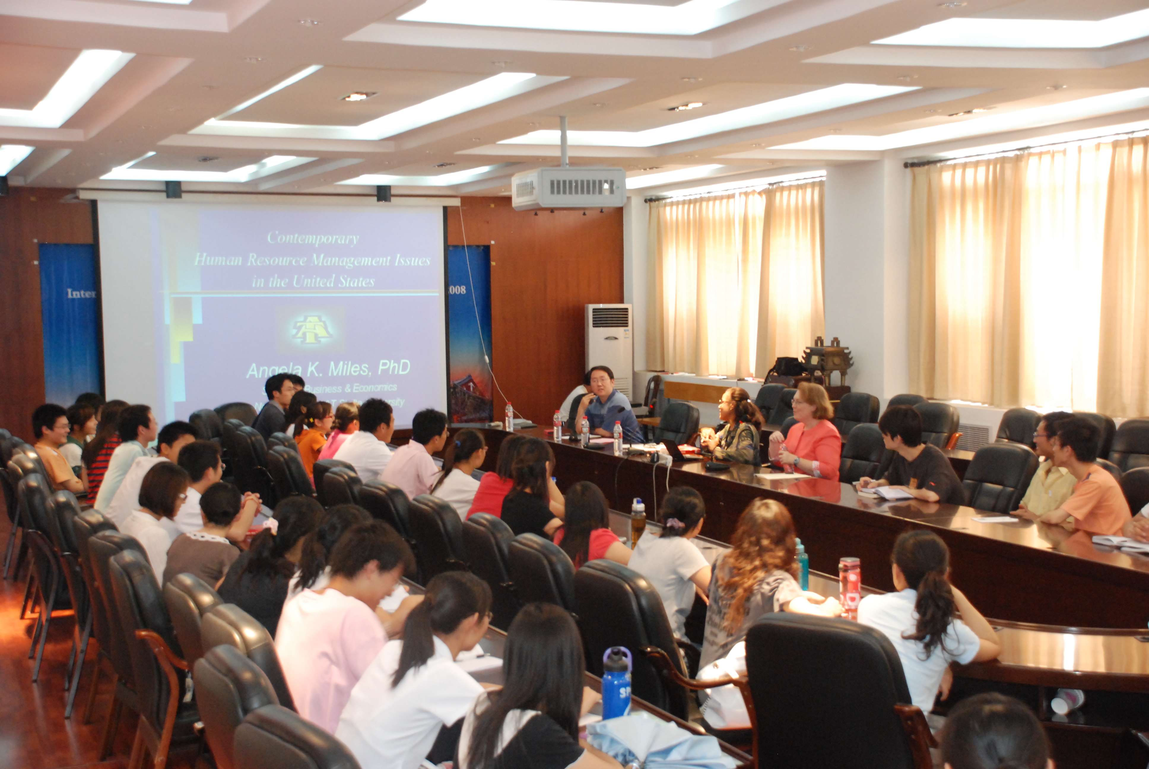 学术报告会上,Alice Stemart教授作了一场题为《Enhancing Organizational Strategic Capabilities:Developing Leadership Skills in Frontine Workers Using a Game-based Simulation》的精彩报告。他围绕议题背景知识,综合论述了如何提高组织能力及如何用游戏模型模拟场景提高一线工人的管理技能。他首先强调领导职能不只是领导品质而是一种领导技能,要提高这种技能,就必须提高一线工人管理能力。接着,他具体的讲解了如何更有效地提高一线工人的领导技能。Angla Miles教授也围绕《Contemporary Issues in Human Resource Management in the United States of America》的主题,对当前美国人力资源管理模式表达了自己的观点。他综合论述了人力资源管理的职能分析,招聘及晋升,绩效考核,薪酬管理和人性化管理等方面的内容,又对美国在人力资源管理方面存在的问题进行了详细的分析,比如工人的不公平待遇、人才流失、管理上的差异化等,他希望我们能够重视这些问题,并很好的解决这些问题,进而形成一种更合理优化、更优化的人力资源管理方法。