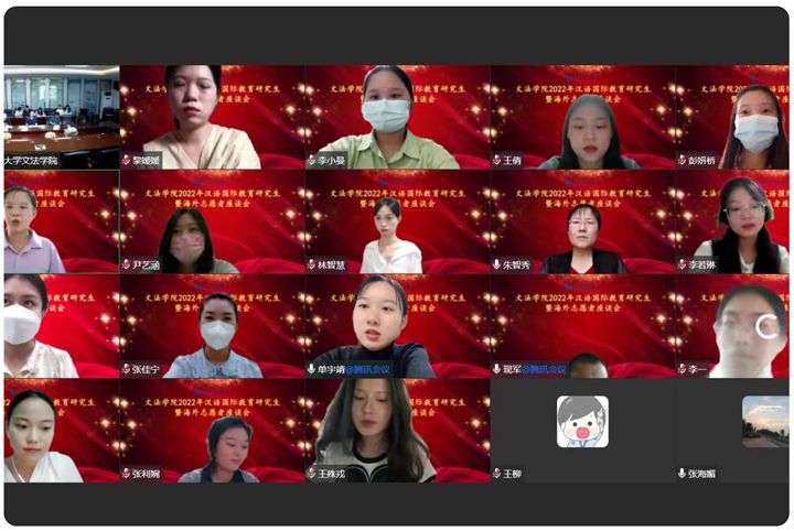 在国庆节来临之际,9月29日下午,文法学院举办汉语国际教育研究生海外国际中文教师志愿者线上座谈会。该院领导班子部分成员,研究生导师代表,以及学院汉语国际教育研究生海外国际中文教师志愿者等20余人参加会议。