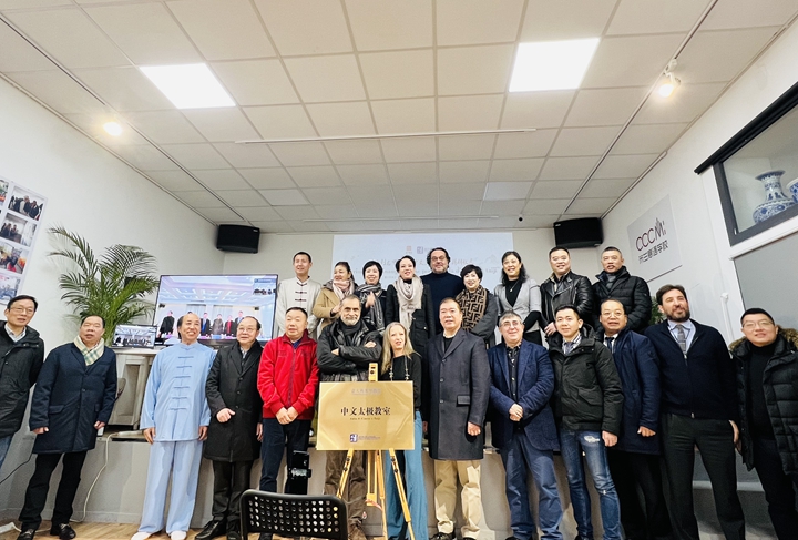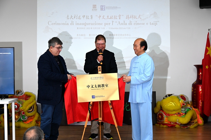 我校与意大利龙甲教育共同申报并获批全球首个“中文太极教室”。12月13日,“中文太极教室”揭牌仪式以线上线下相结合的方式在意大利米兰龙甲教育总部举行。教育部中外语言合作交流中心主任马箭飞、我校校长杨小林线上出席活动,意大利龙甲教育校长李群来、伦巴第大区教育厅私立教育局局长莱蒂西亚、米兰华人华侨工商会会长周立新、全意功夫联合会主席瓦尔特、意大利费米高中校长朱塞佩等现场出席。学校校办、国际处、文法学院、体育学院、外国语学院负责人参加活动。