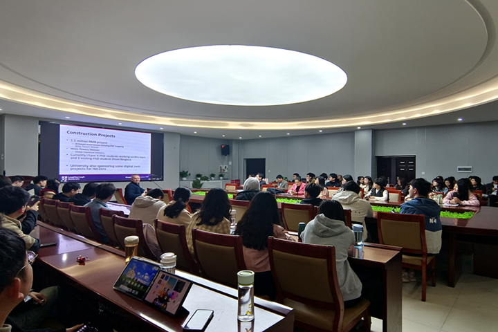 到访期间,克雷格·汉考克还为我校学生作了两场学术报告。28日上午,克雷格·汉考克在测绘学院作了题为《用于建筑风险和太阳能发电场监控的数字孪生》的学术报告,就数字孪生在建筑物风险评估上的应用和在太阳能板的监测等内容展开研讨,测绘学院和土木学院100余名师生现场聆听。28日下午,克雷格·汉考克还为我校学生作了一场题为《英国大学生活》的报告,全校近200名师生到场聆听。他以拉夫堡大学为切入点,详细介绍了英国大学的教育体系、课程设置、教学特色、设施情况以及申请赴英留学的基本条件和奖学金等情况。