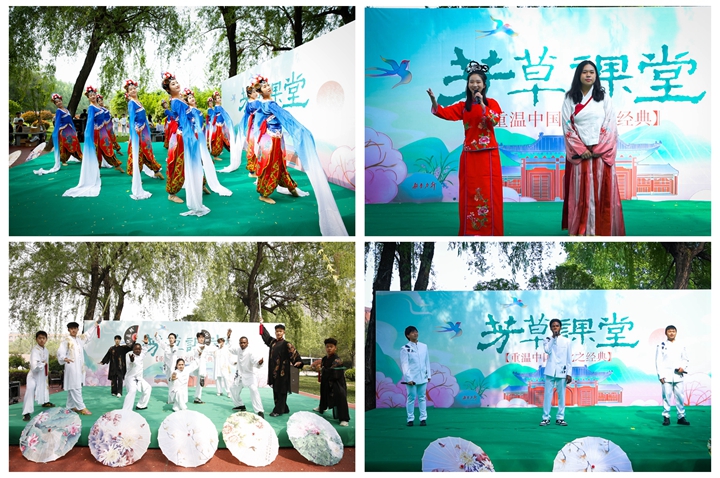 春风扶柳,草长莺飞。“芳草课堂”随即开课,以“重温中国文化之经典”为主题,经典诵读和歌舞表演交替进行,“太极论道悟哲理”“诗词歌赋赏春天”“舞袖翩翩感节气”“品茶听戏知古意”四个篇章精彩纷呈。琴音悠扬、书声郎朗,中外师生共同诵读《周易》《道德经》《黄帝内经》《中庸》《论语》等中国典籍中的哲理名句,共同吟唱二十四节气相关的诗词歌赋,感悟中国文化智慧、品味中国语言魅力,增强中国文化认同。诵读之余,还有中外师生共同带来的精彩演出轮番上演。《太极韵味》尽显太极拳的刚柔并济、超然洒脱;古筝弹奏《春分》声情切切、绵延悠长;《上春山》唱响了春天的序曲,《袖舞翩跹》更是“清歌翩霓裳,倩影舞悠然”;豫剧《花打朝》高亢、明快的唱腔将“七奶奶”的形象跃然呈现,一曲《万疆》唱出了华夏之壮美、山河之辽阔。最后,由国际学生合唱的《我爱你中国》将活动推向了高潮,句句情真意切,深入心扉,唱出了在座每一位观众的心声。