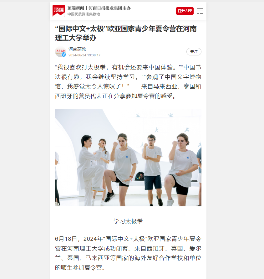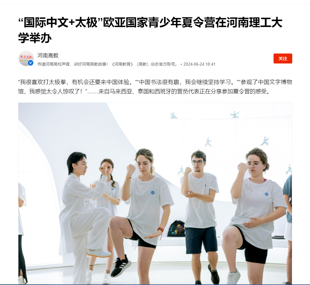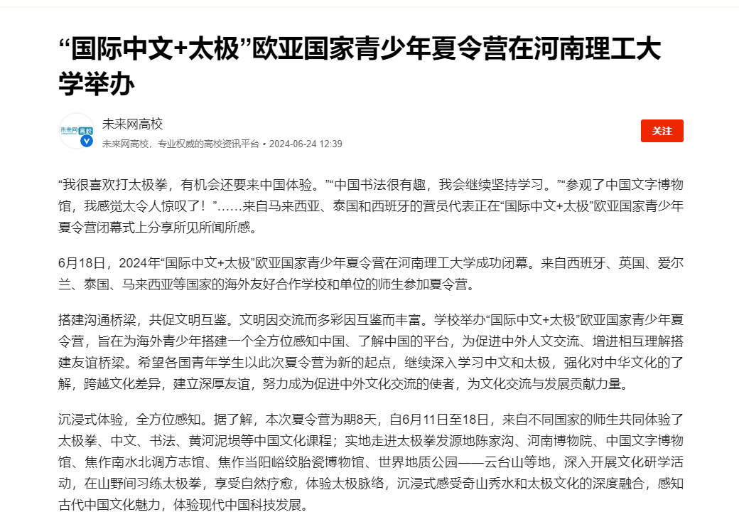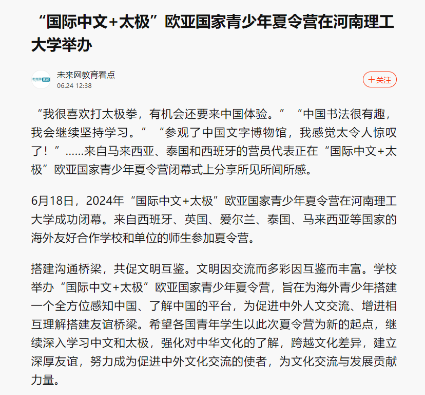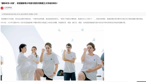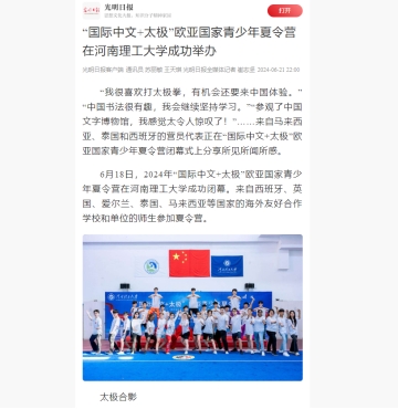 近日,2024年“国际中文+太极”欧亚国家青少年夏令营在河南理工大学成功闭幕。连日来,光明日报客户端、河南日报客户端等媒体报道。相关内容如下: