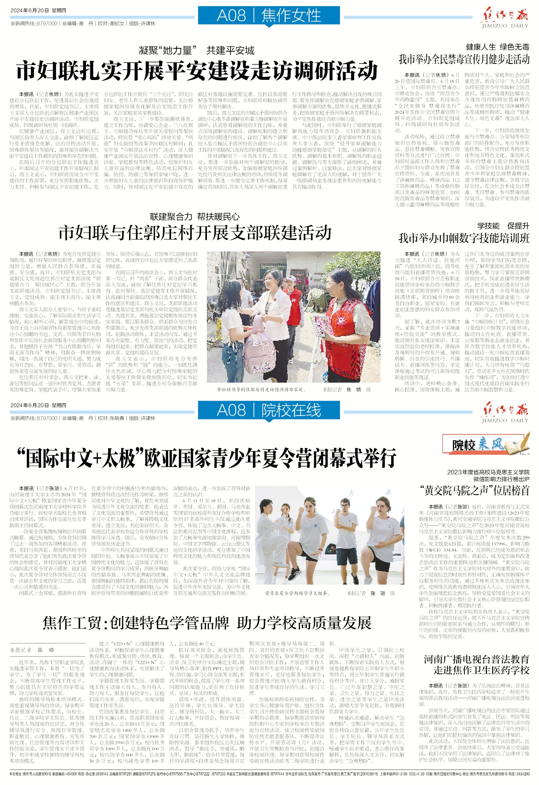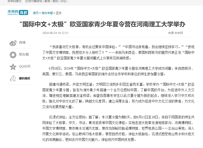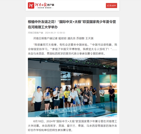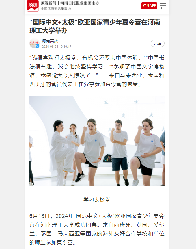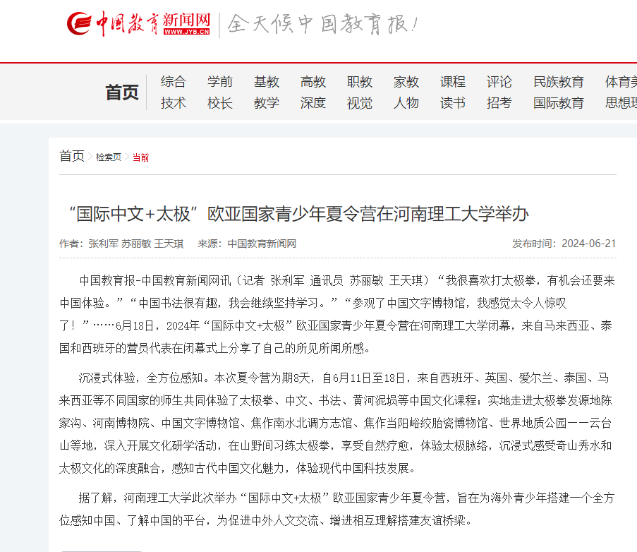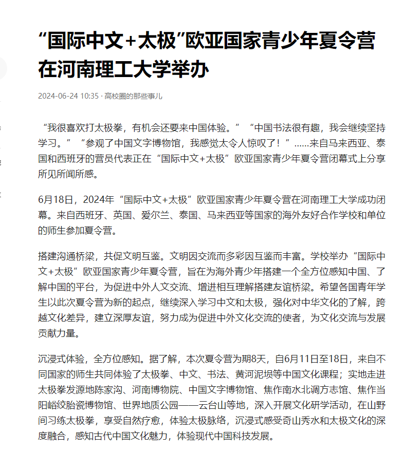 近日,2024年“国际中文+太极”欧亚国家青少年夏令营在河南理工大学成功闭幕。连日来,光明日报客户端、河南日报客户端等媒体报道。相关内容如下: