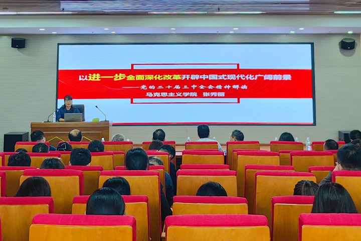 10月8日下午,在国家重点实验大楼345会议室,校办、校工会、财务处、国际处、国资处、利莫瑞克国际学院、郑州高等研究院联合举行学习贯彻党的二十届三中全会精神宣讲报告会。河南省教学标兵、校宣讲团专家、校示范教师、马克思主义学院副教授张秀丽作专题宣讲报告,国资处处长马建宏主持报告会,校办、校工会、财务处、国际处、国资处、利莫瑞克国际学院、郑州高等研究院全体教职员工参加了此次报告会。