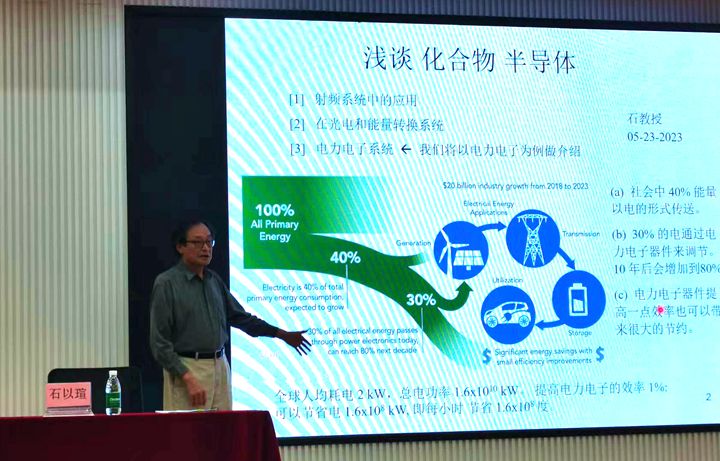 讲座中,石以瑄首先介绍了世界电力使用及电力传输的基本情况,指出通过电力电子器件可以有效调节电力传输效能。随后他重点讲解了化合物半导体在射频系统、光电、能量转换系统以及电力电子系统领域的应用、第三和第四代半导体材料、不同类型的化合物半导体、以及化合物半导体材料的主要性能等。最后,他结合实例介绍了几种常见化合物半导体材料的制备技术。