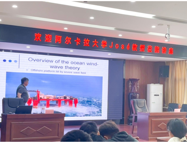 报告伊始,José教授以生动的影像资料切入,系统阐释了海洋波浪的生成机制与核心物理特性。通过构建波高、波长、周期等关键参数的数学模型,揭示了海浪能量传递与海洋环境变化的深层关联。其深入浅出的讲解使在场师生快速建立起对海洋动力学的系统性认知。